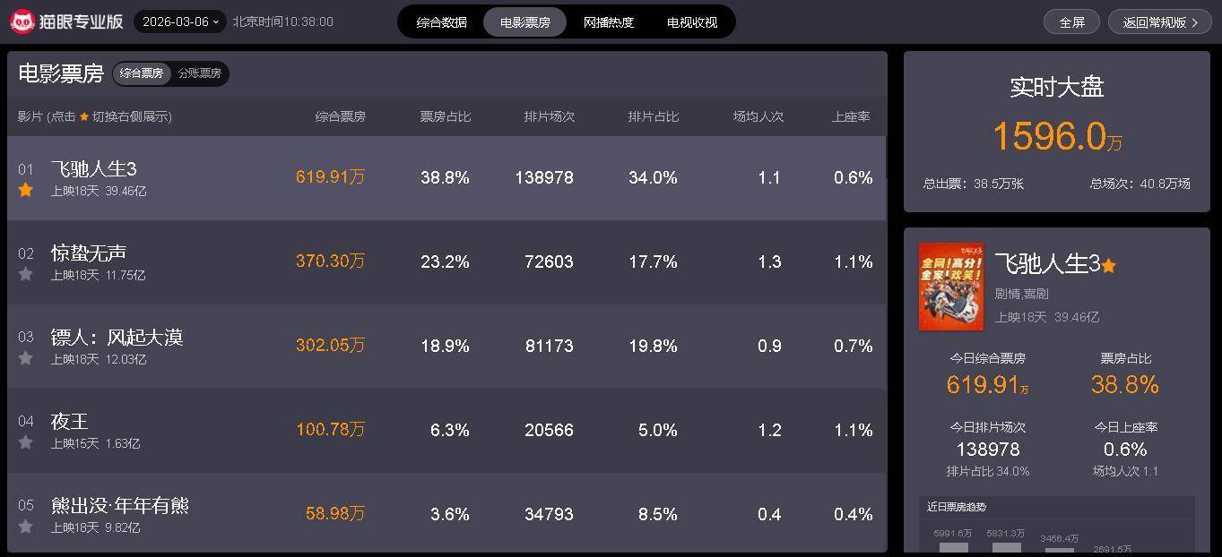 为止3月6日上昼9时38分,从“猫眼专科版”及时数据闪现可知,刻下热映电影中j9九游会真人,单日详尽票房榜前五分散如下:
