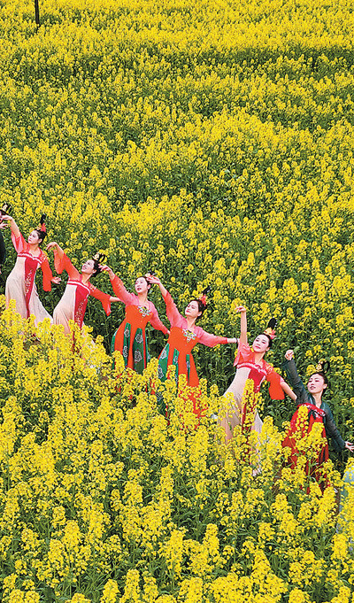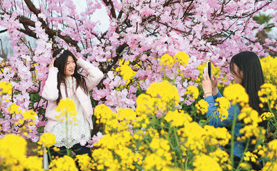 ">在湖南省常德市武陵区丹野花田农场里,油菜花、桃花竞相敞开,蛊惑搭客前来赏花拍照。 蔡文龙摄(东说念主民图片)