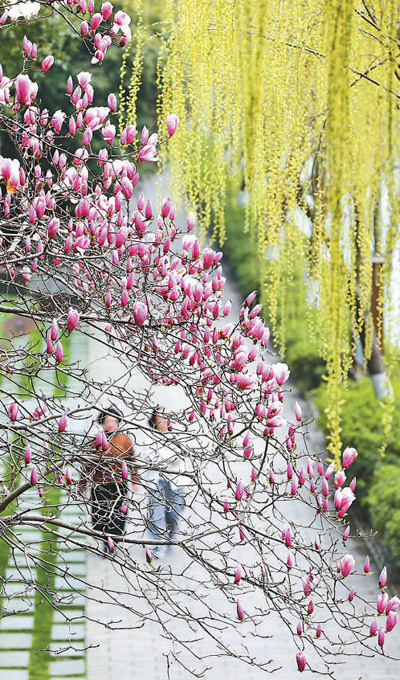 ">安徽省淮北市南湖湿地公园春光明媚,市民、搭客纷纷前来踏青赏梅。 张红心摄(东说念主民图片)