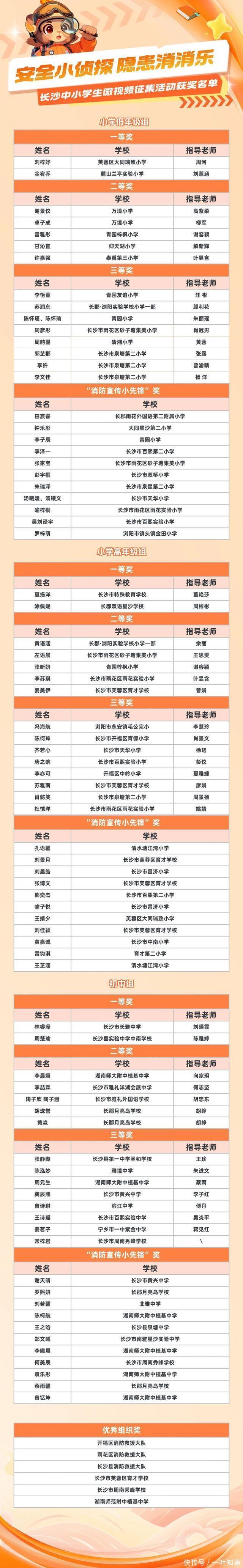 流程评审的多轮考试, 获奖名单,隆重出炉! 现时,就让咱们一同揭晓—— 哪些“小考核”C位出说念? 荣誉文凭+惊喜奖品,花落谁家? “安全小考核隐患消消乐”长沙中小学生微视频 搜集行径获奖名单公示 由长沙市消防补救支队、长沙晚报社不时专揽,长沙晚报校园记者俱乐部经办的“安全小考核隐患消消乐”长沙中小学生微视频搜集行径自开动以来,受到全市广众人生和家长的积极响应与祥和参与。 本次行径共收到来自全市各中小学校的优秀微视频作品500余件,充分展现了长沙学子是非的不雅察力、猛烈的安全意志与精粹的社会实行智商。经评审委员会严格评审,抽象考量作品的隐患典型性、整改灵验性、抒发感染力、学问专科性与传播影响力等维度,最终评比出小学低年岁组、小学高年岁组、初中组共78名学生获奖,44名磨真金不怕火获“优秀开垦浑厚”奖,6个单元获“优秀组织奖”。 现将获奖名单进行公示,公示时刻为11月29日至12月2日。公示工夫,宽容社会各界监督评议,商酌概念可回电响应,商酌状态:长沙市消防补救支队(0731-82686178)、长沙晚报校园记者俱乐部(0731-82205183),咱们将实时受理,厚爱核查。 学生奖项(共78名) 一等奖(6名):奖金1000元/名+荣誉文凭 二等奖(15名):奖金800元/名+荣誉文凭 三等奖(24名):奖金600元/名+荣誉文凭 “消防宣传小前锋”奖(33名):奖金200元/名+荣誉文凭 优秀开垦浑厚(共44名) 奖金200元/名+荣誉文凭 优秀组织奖(共6个单元) 荣誉文凭 附:获奖名单