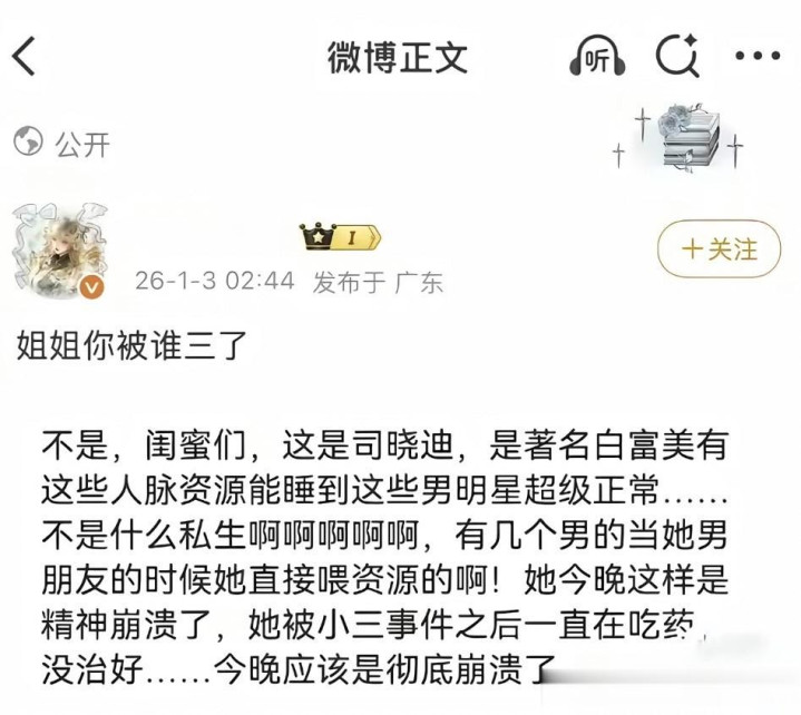 2026开年文娱圈第一波大瓜,竟是网红掀翻的“斥责狂欢”!半夜,网红司晓迪倏得爆料,晒出蒙眬像片和碎屑化聊天记载,宣称与鹿晗、范丞丞、蔡徐坤等10多位顶流有染,甚而造谣王安宇与关晓彤的绯闻,放言“全内娱顶流我皆睡收场”。