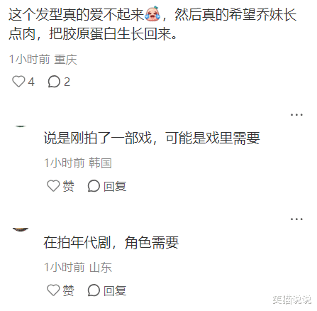 诚然有好多网友吐槽宋慧乔的这个短发剪得太短了,可是好在宋慧乔大致hold得住这个发型。这个发型是宋慧乔为了相助之前完了的新剧里的扮装形象所修剪的,除此以外,宋慧乔也为了新剧的扮装形象而致力边界体魄体重,不得不说,宋慧乔为了新剧付出了许多。如今她拍的新剧仍是完了了,粉丝们也暗示宋慧乔这下子不错好好休息,趁机将头发留长了。