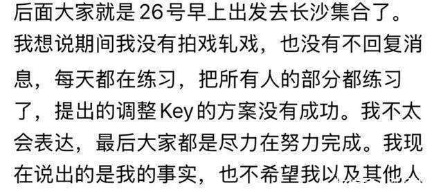 21号晚间的时候,房琪和她进行了电话调换,进一步针对团队歌词分拨等问题进行讨论,况兼报备了我方22日和23日两天的责任行程,还建议房琪不错问问彭小苒的想法。22号日间房琪与彭小苒进行了线上的讨论,何泓姗在责任破绽也参与了恢复。23日到24日彭小苒生病了,何泓姗还去调换慰问,只是在此之后三东谈主就莫得群内交流了。何泓姗终末标明我方是因为不会调换导致建议莫得被遴荐,但在这个技能既莫得尬戏也莫得不配合,径直反驳了不雅众关于她尬戏和不配合队长的质疑。