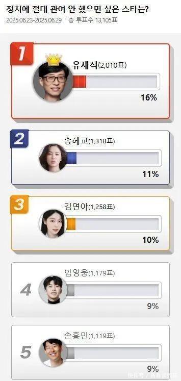 着力,认为13105票中,刘在石以2010票(16%)位居第一,成为网友最不但愿参预政坛的艺东说念主明星。紧随后来的是宋慧乔1318票(11%)以及金妍儿1258票(10%)。