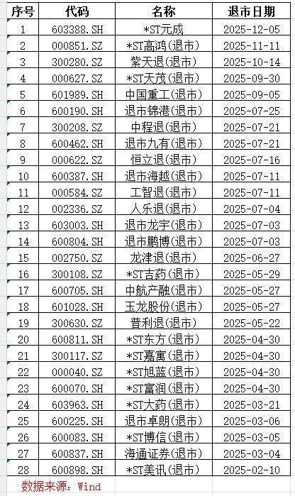 值得珍摄的是,2025年是新“国九条”及退市新规全面落地的首年,A股阛阓抓续倚势凌人。据大河财立方记者梳理,本年扫尾12月4日,A股已有28家公司退市,原因涵盖紧要积恶强制退市、股价低于面值等。