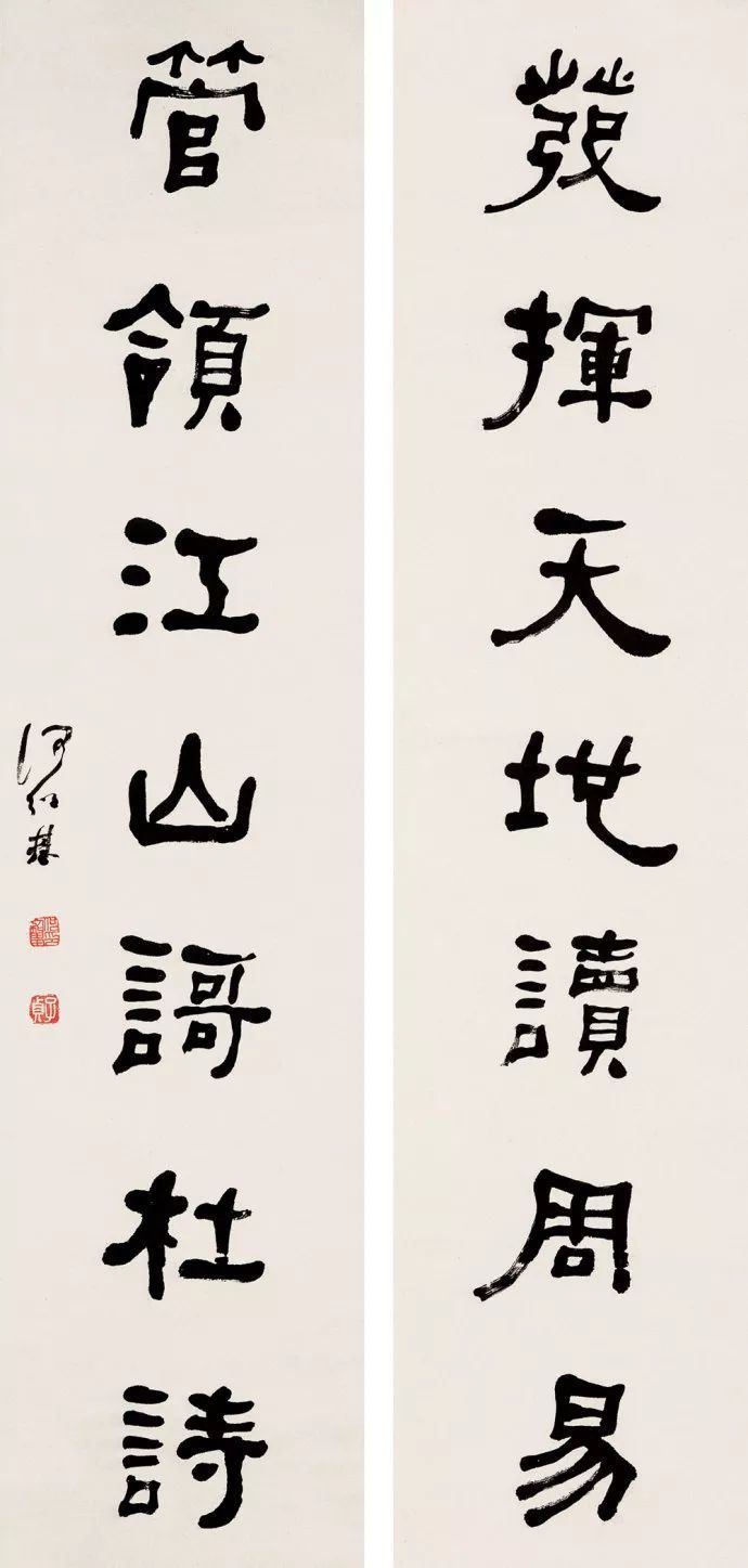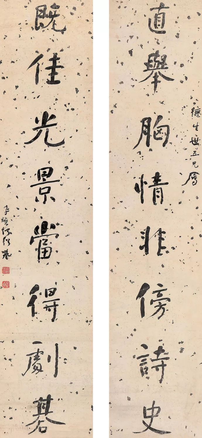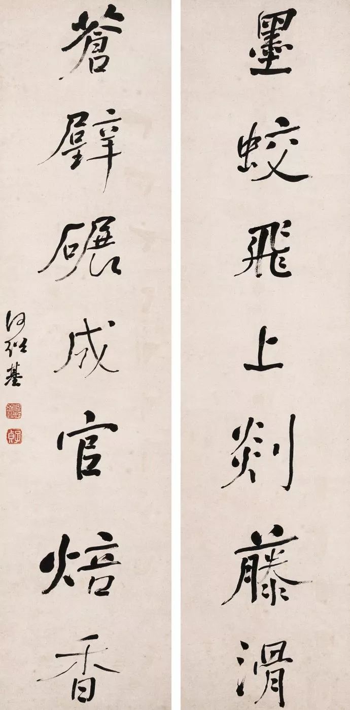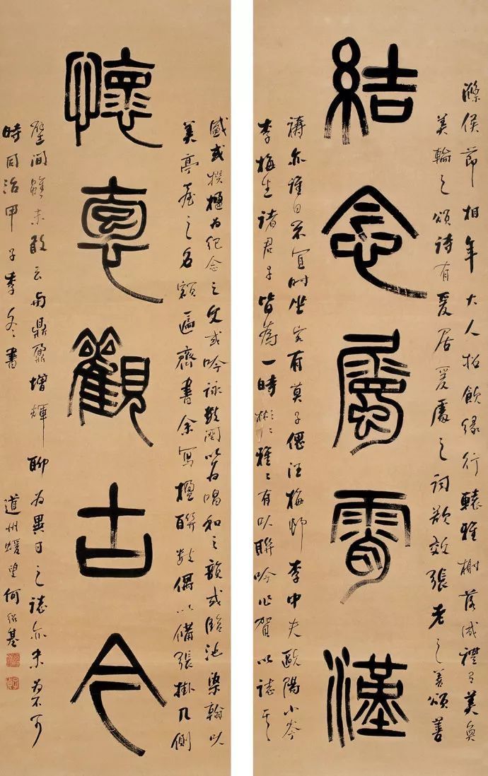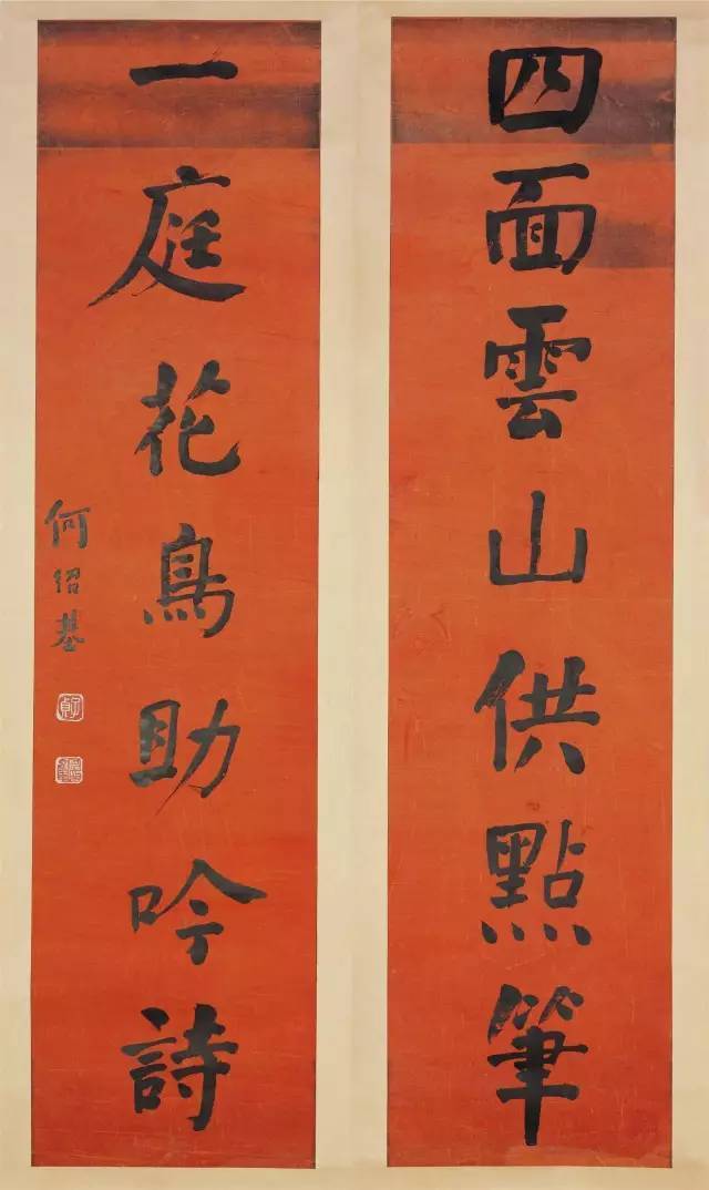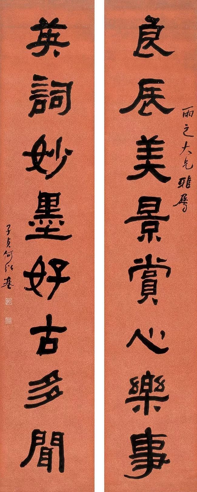 最逗的是,何绍基的字还带着“书卷气”。他鼓诗书,写字时总忍不住把文东谈主的酸劲儿掺进去。比如他写对子,上联“春风大雅能容物”,下联“秋水著作不染尘”,字里行间皆是文东谈主的自高和倔强,像在说:“我写字不为助威谁,就图个我方欢笑!”