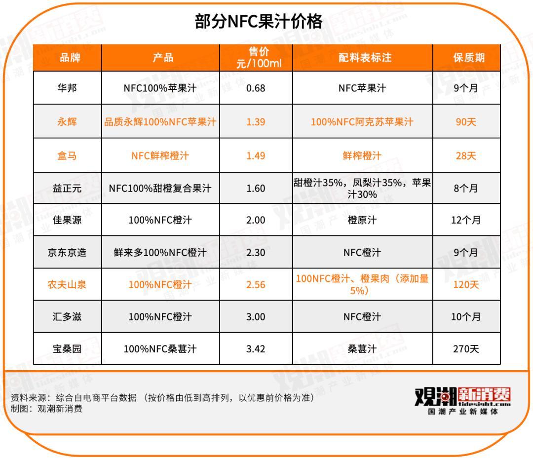 汇源、农夫山泉等巨头都在这一阶段最初布局。汇源于2015年推出“鲜榨坊”系列NFC果汁,农夫山泉则在2016年1月推出自后大杀四方的17.5°NFC橙汁。凭据第一财经的统计,在2015年前后,市集曾透露出30~40个NFC果汁品牌。